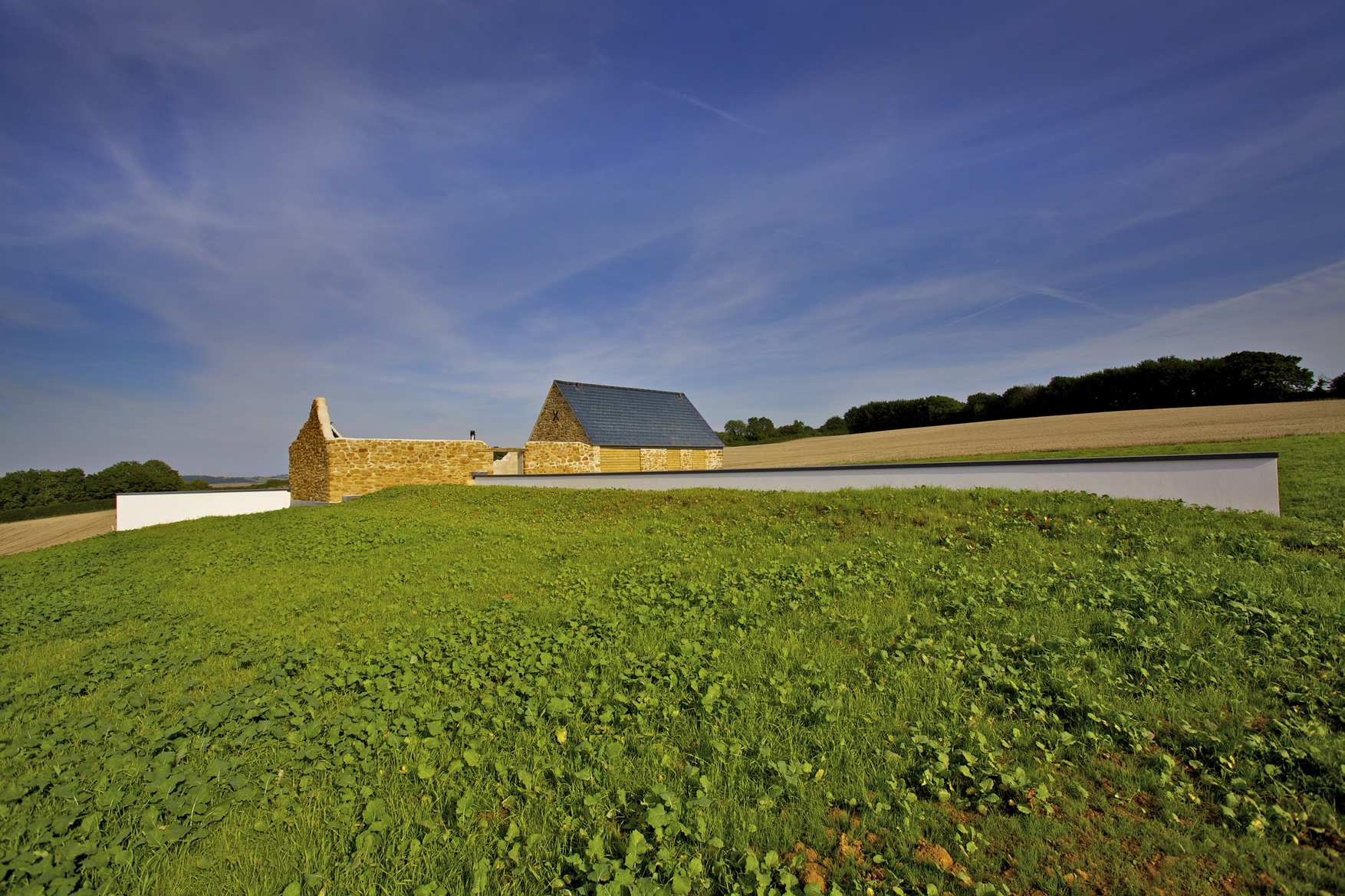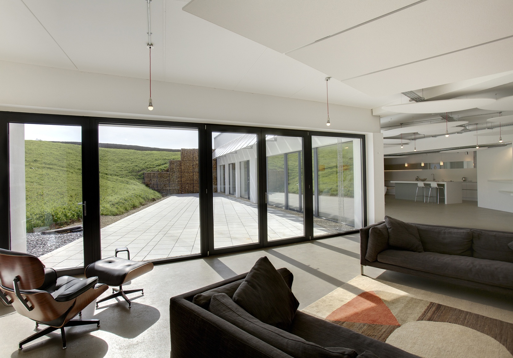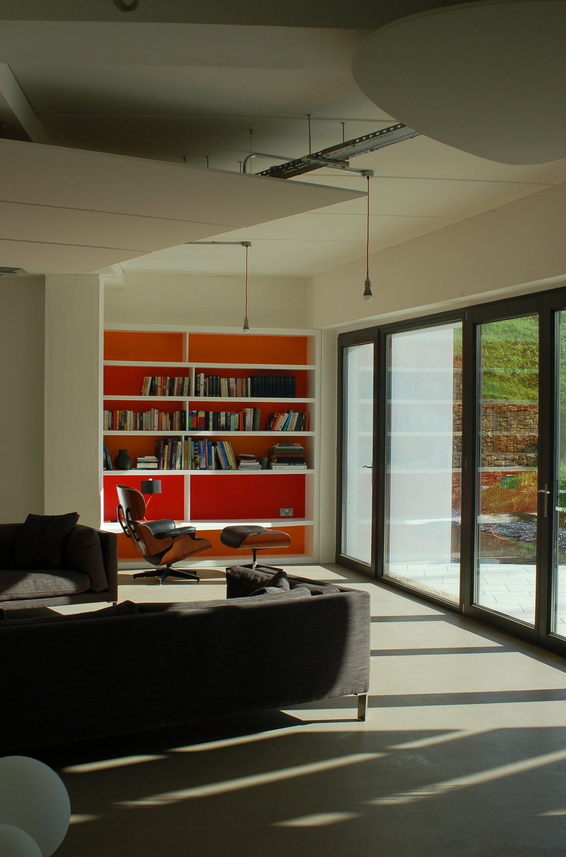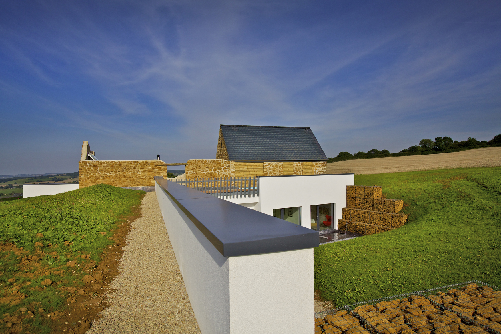 These challenges were addressed by proposing to convert the barn into an office, and to slot the new house in underneath it. So, despite the sensitive location, the design of the house was able to be very bold. The existing barn has been carefully restored, whilst the new building underneath and adjacent to it is in contrast strikingly modern. Being dug into the hill to be invisible from the surrounding countryside, this is essentially a stealth house, with absolute minimal visual as well as environmental impact on the landscape.