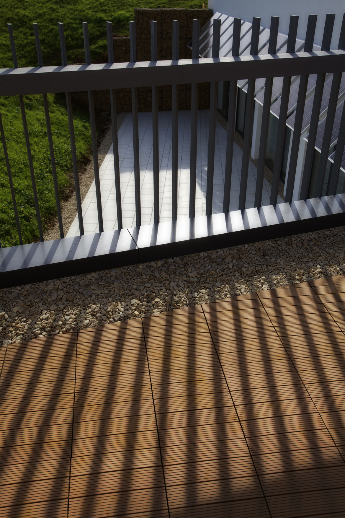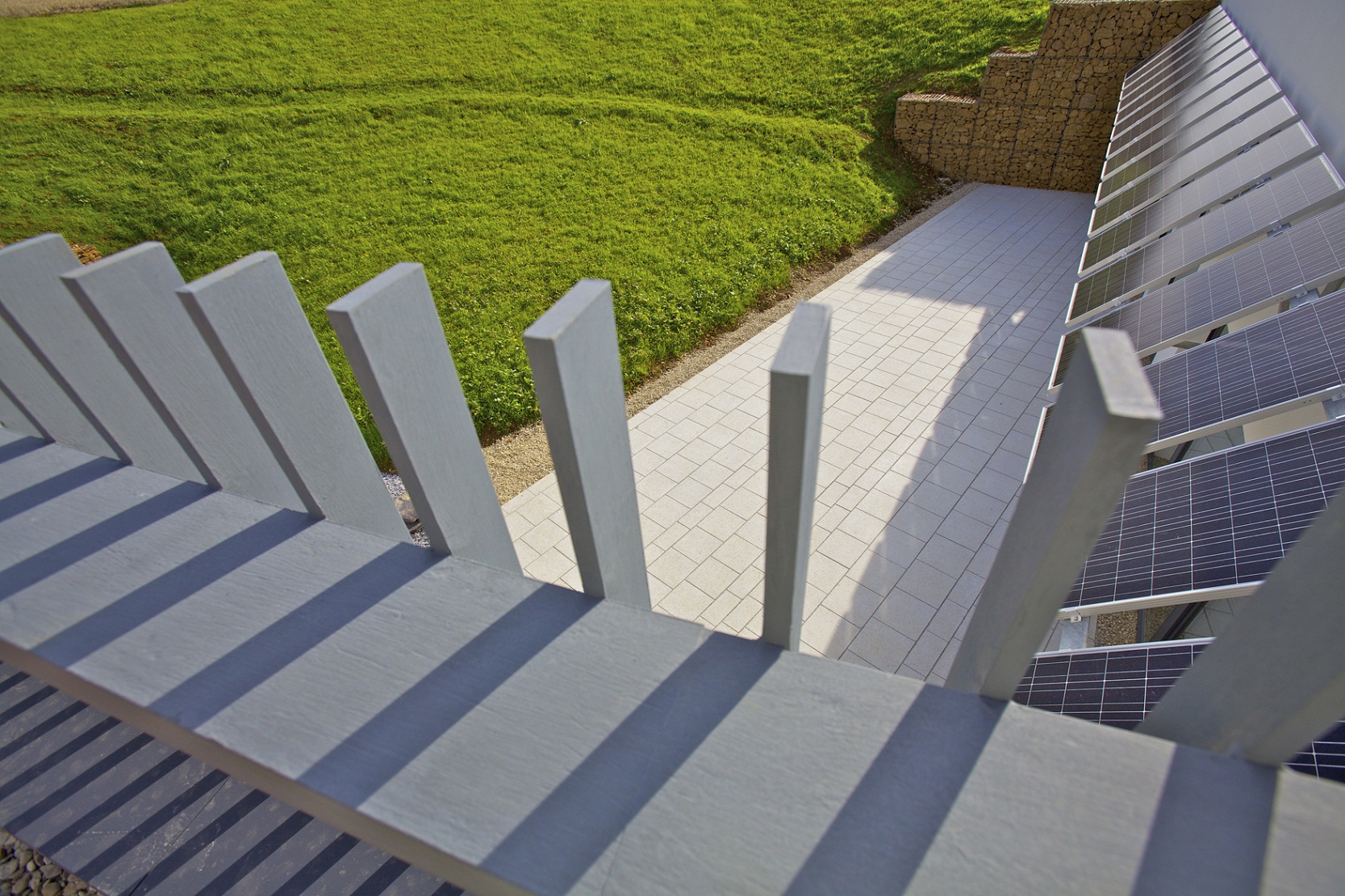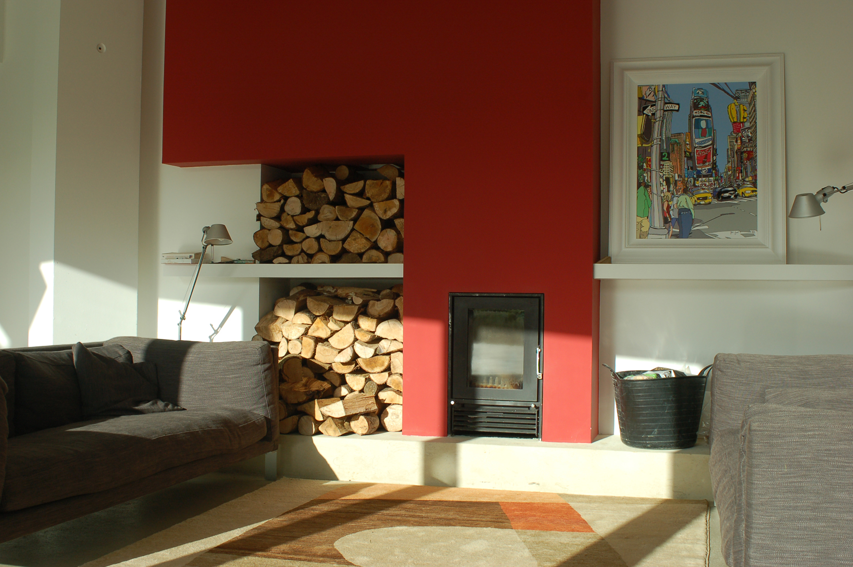 A large photovoltaic array (which also doubles as solar shading to the south facing glazing) and an innovative roof-integrated solar hot water system provide most of the house’s energy requirements, topped up in winter by a small wood burning stove with back-boiler.