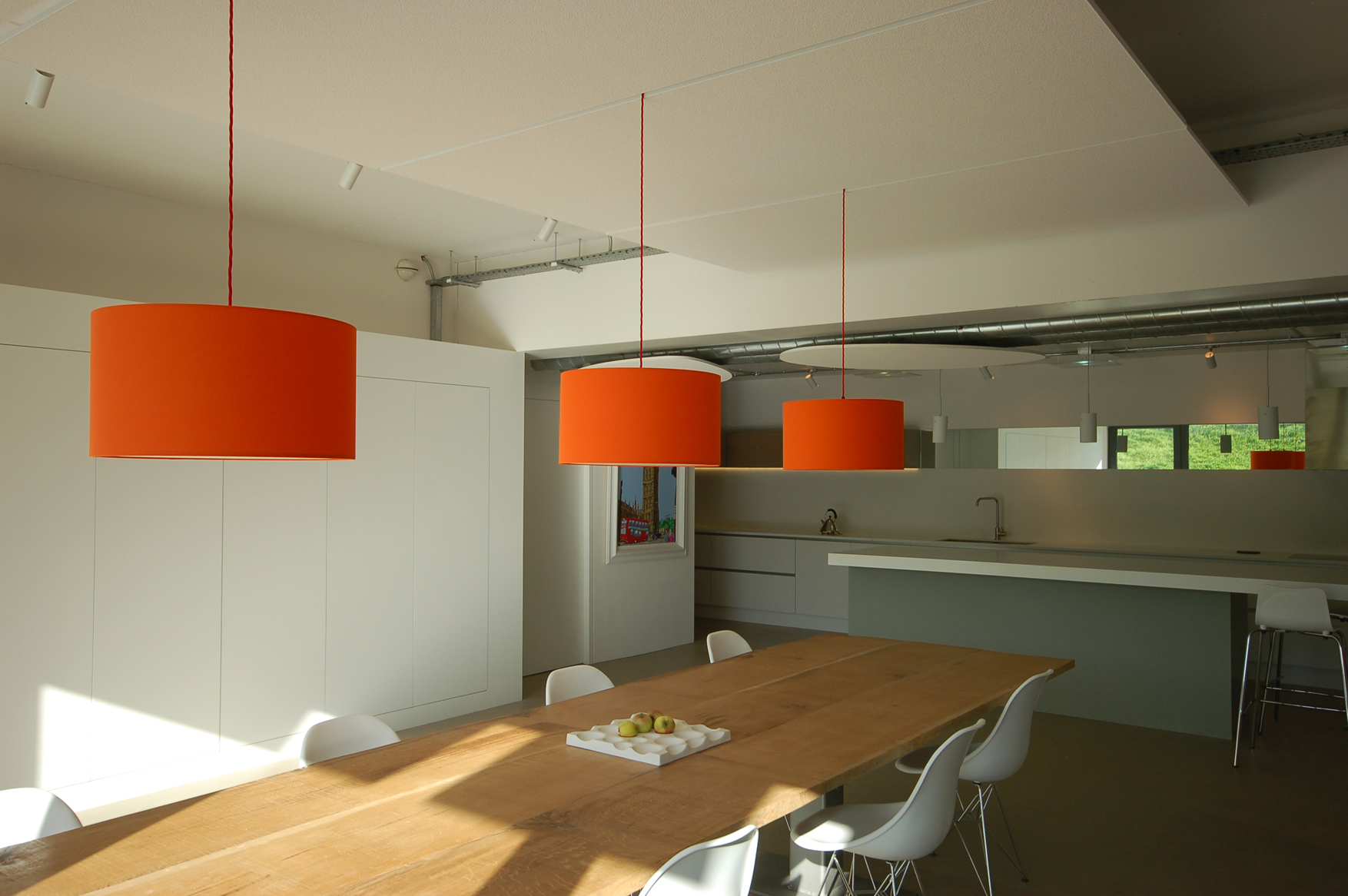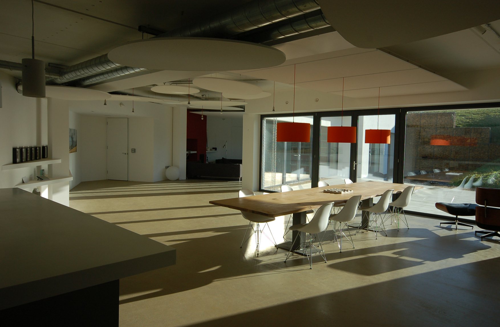 The interior design is functional, stylish, industrial minimalism. The internally exposed concrete structure gives a richly textured finish, softened by a thin spray applied plaster finish. Galvanised steel ventilation ductwork and wiring conduits are celebrated rather than hidden.